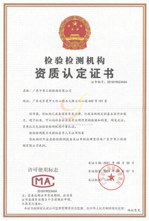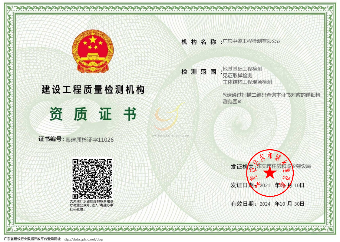 广东中粤工程检测有限公司成立于2016年,位于东莞市大岭山镇。我司本着技术专业化、服务专业化的经营理念,努力将公司打造成为一个集房建工程检测、水利工程检测、市政工程检测、交通工程检测、房屋鉴定等相关技术服务于一体的大型检测企业。