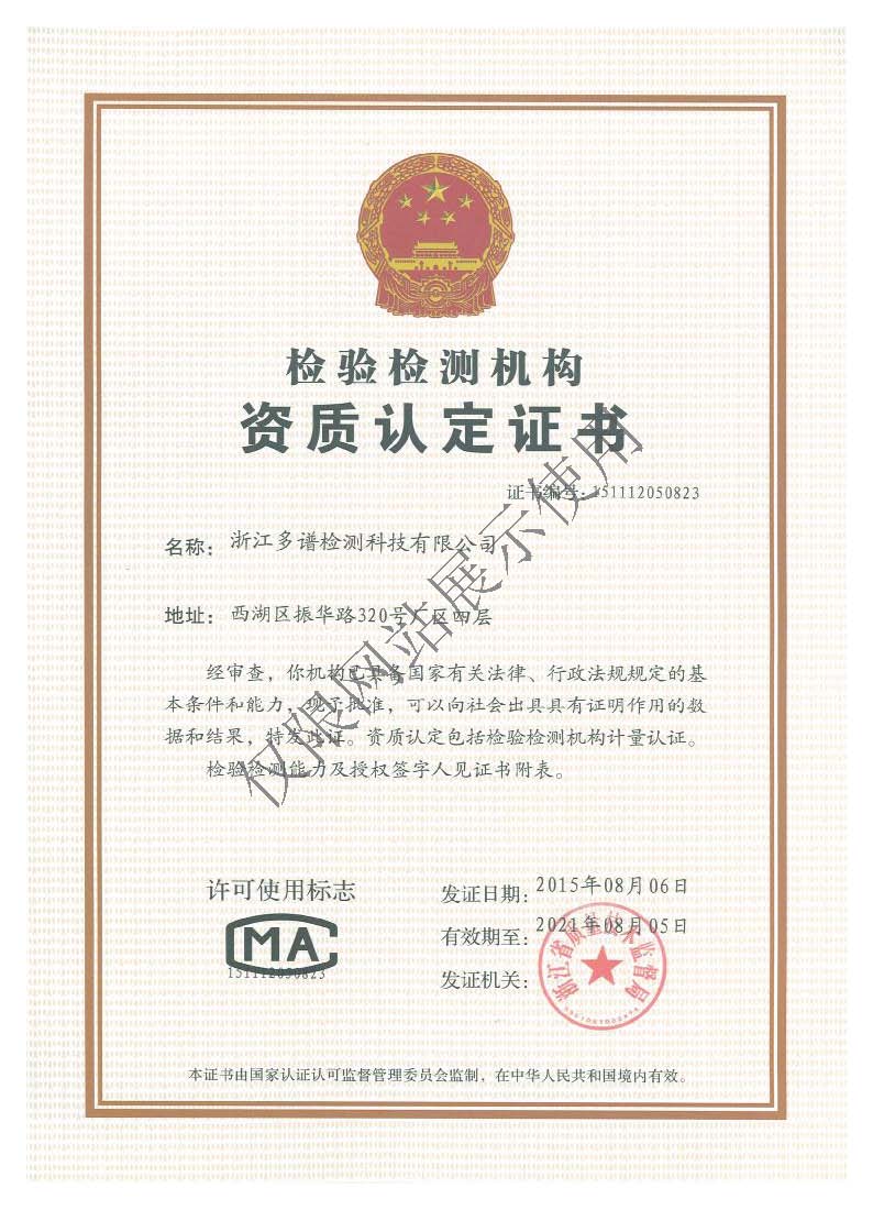 5、公司于2008年4月至2017年4月期间,先后九次进行计量认证扩项,目前通过计量认证的总参数为944项。[目前证书编号:2012110823R]。